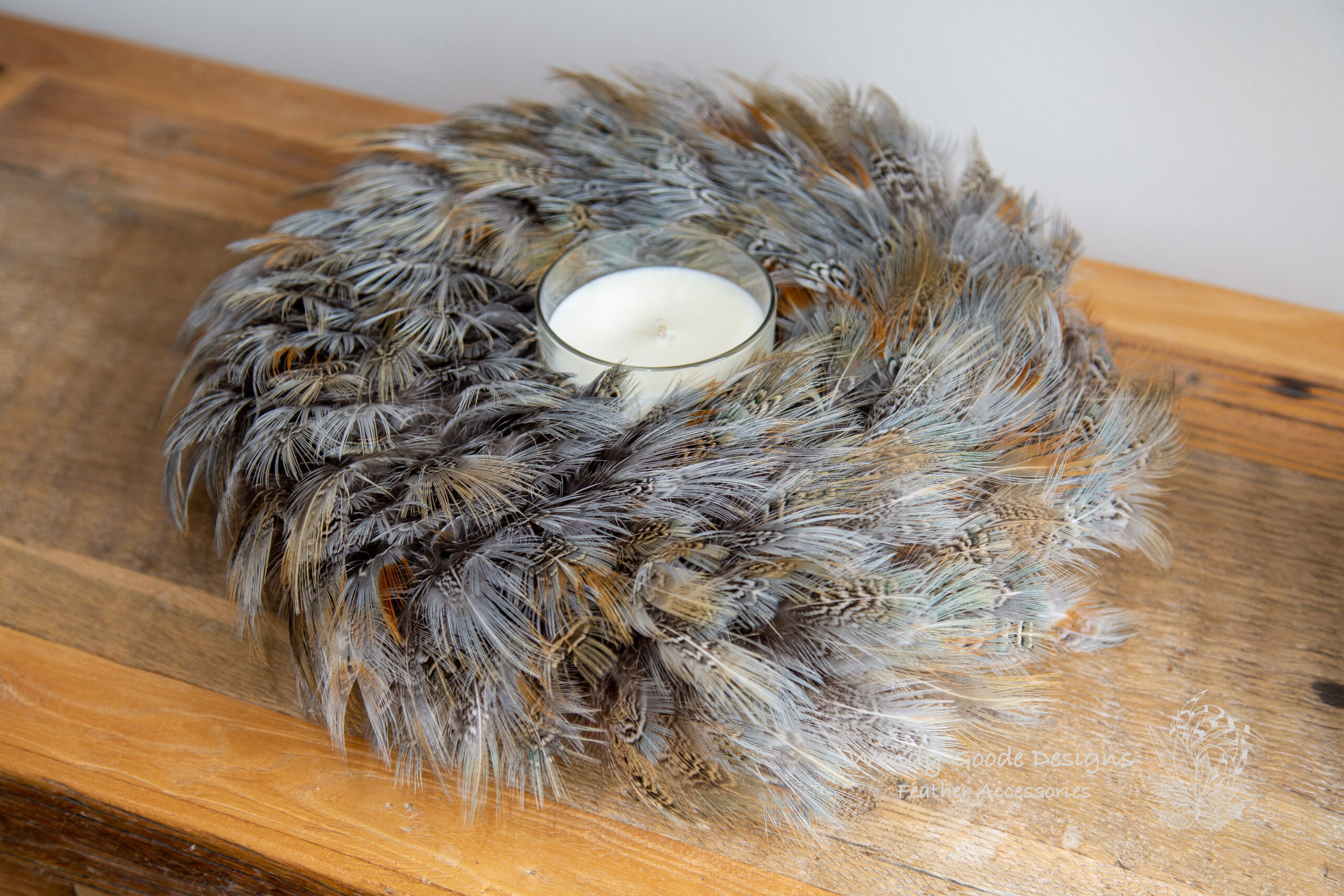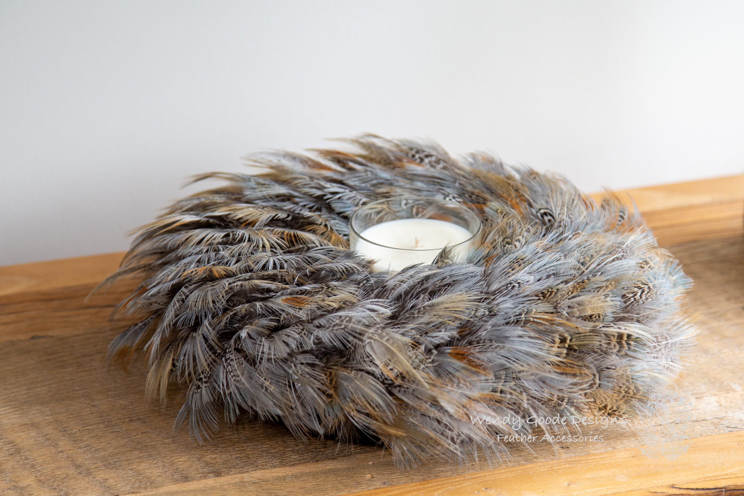 This handcrafted feather wreath reflects the natural elegance and considered craftsmanship at the heart of Wendy Goode Designs.