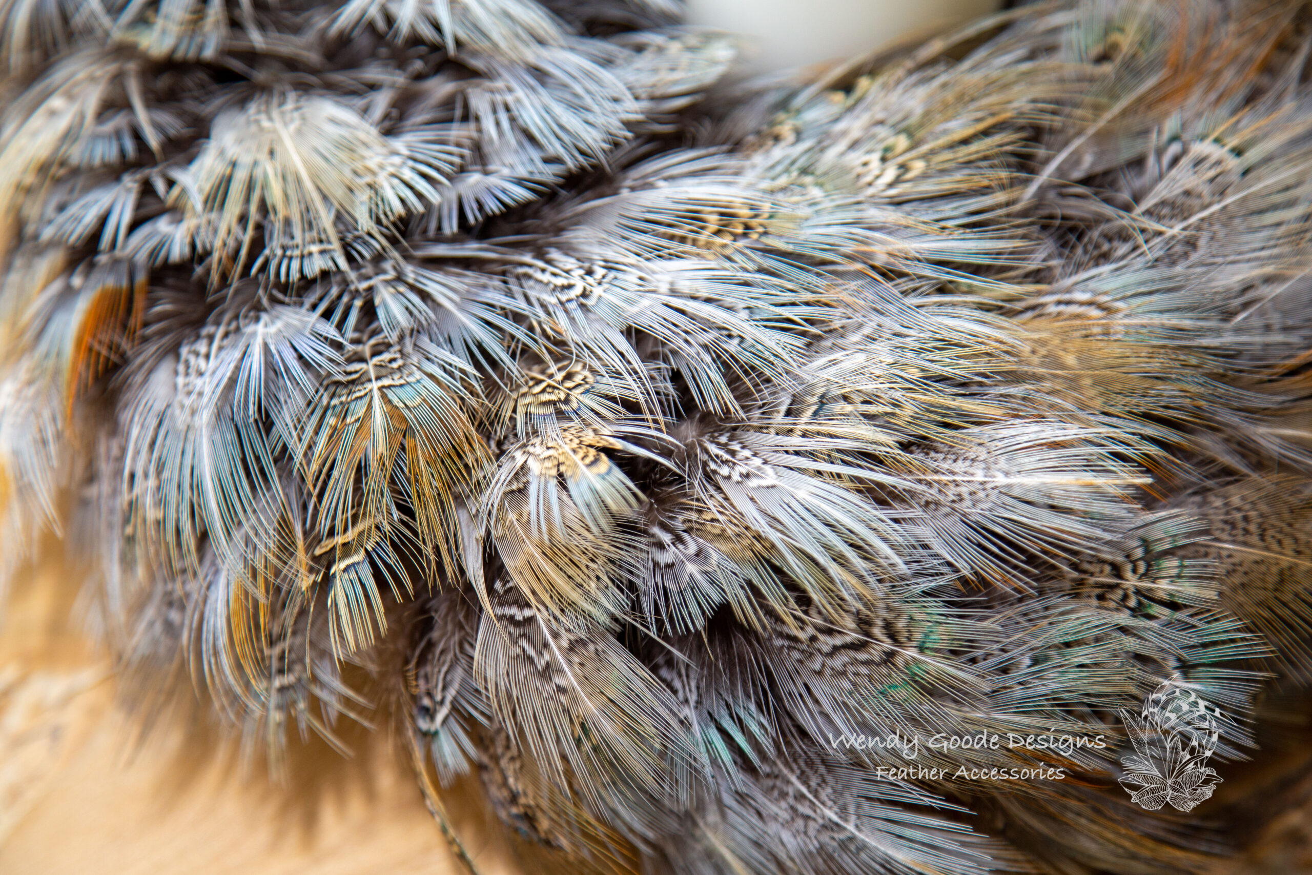 Created using the distinctive blue rump feathers of the pheasant, the wreath displays subtle layers of soft blue-grey, warm taupe and natural feather markings. The result is a piece that feels both organic and quietly luxurious, with gentle movement and depth from every angle.
