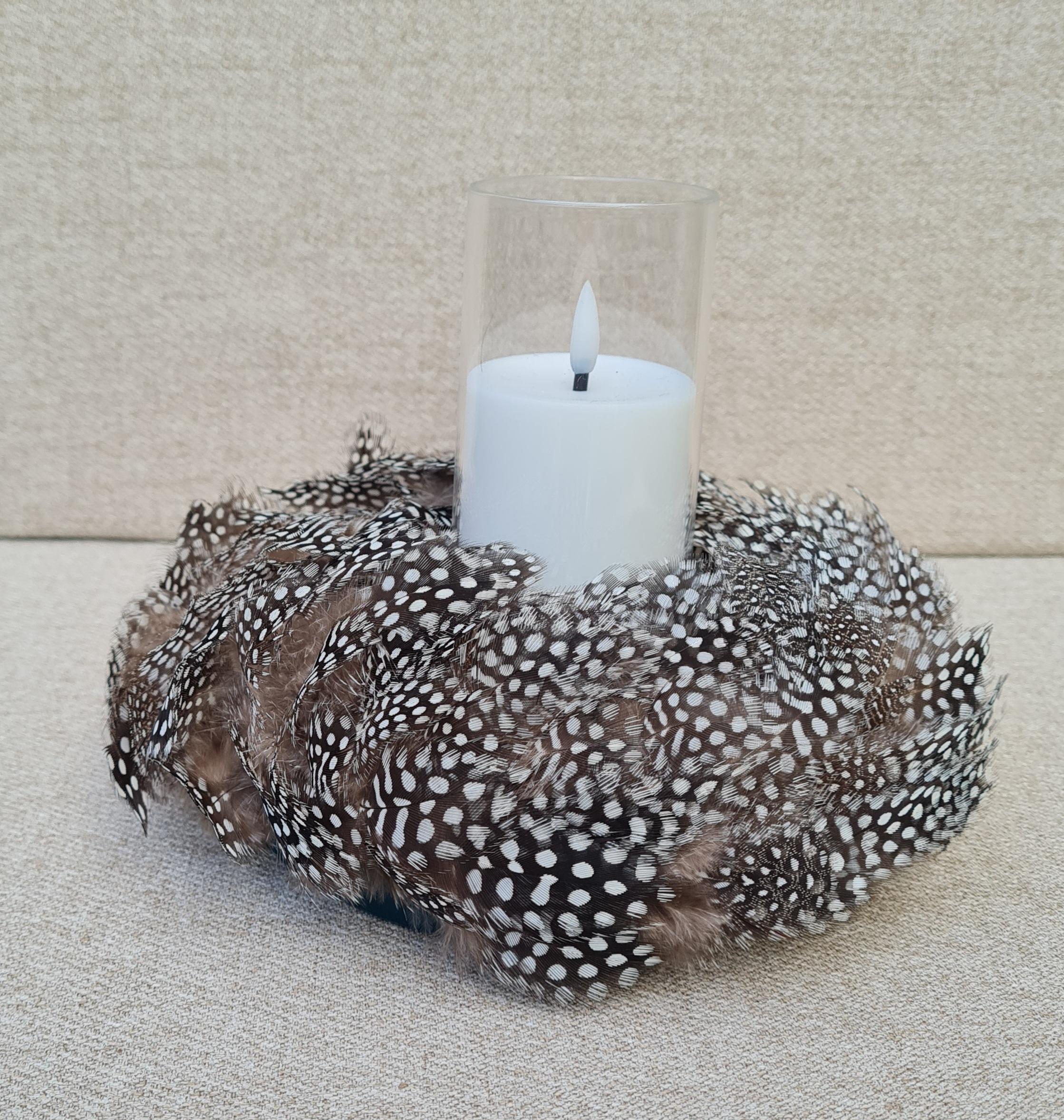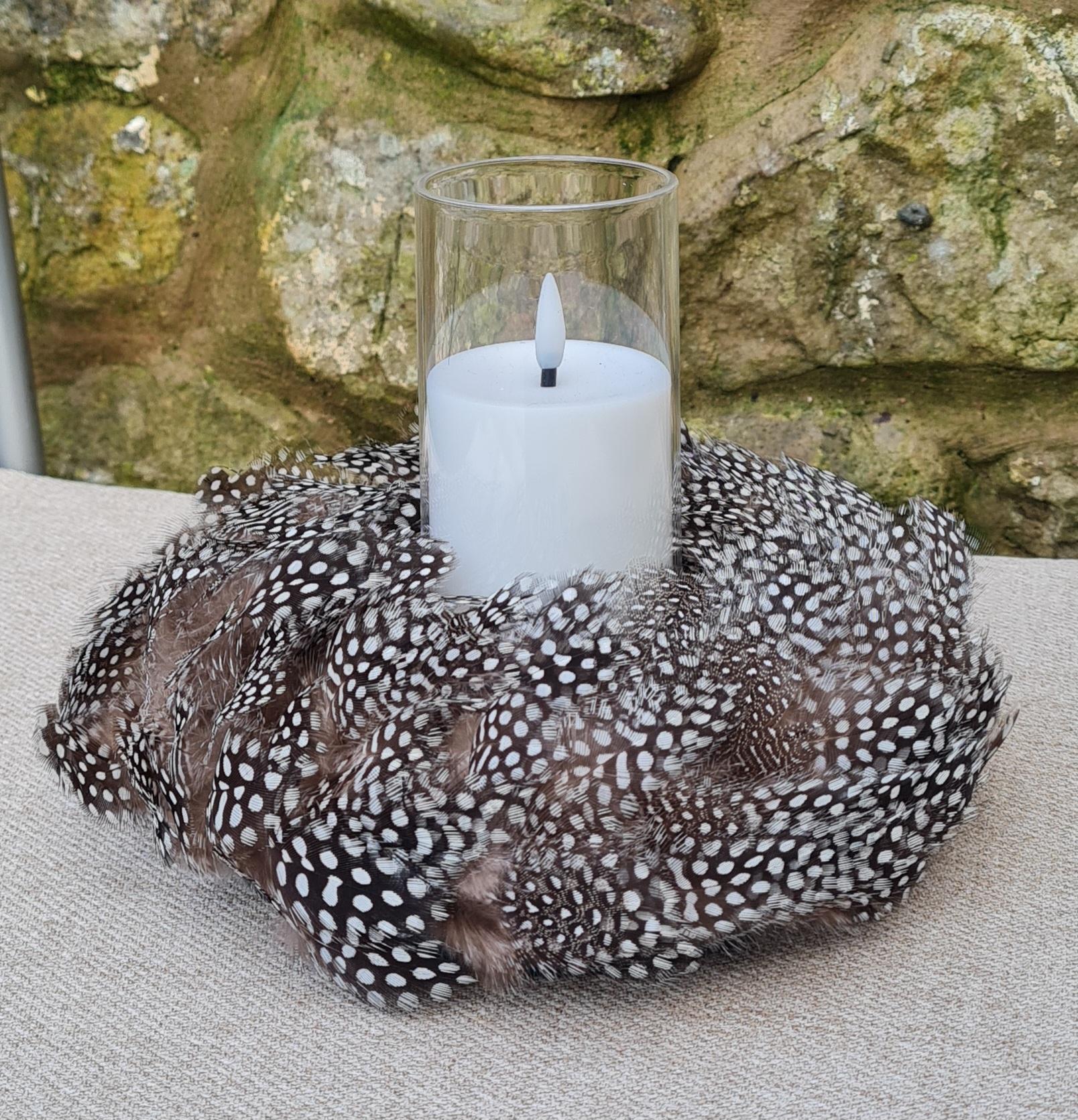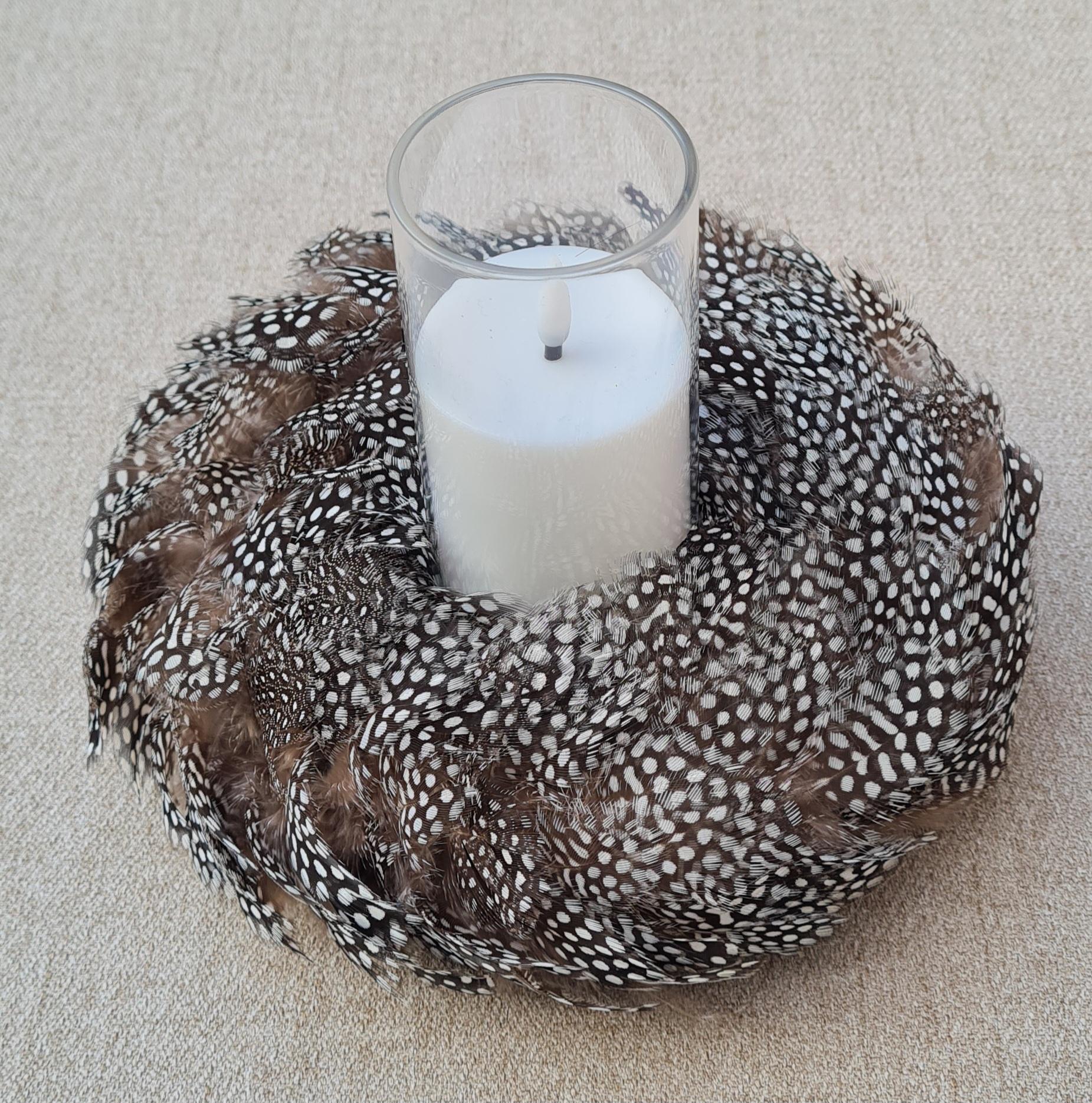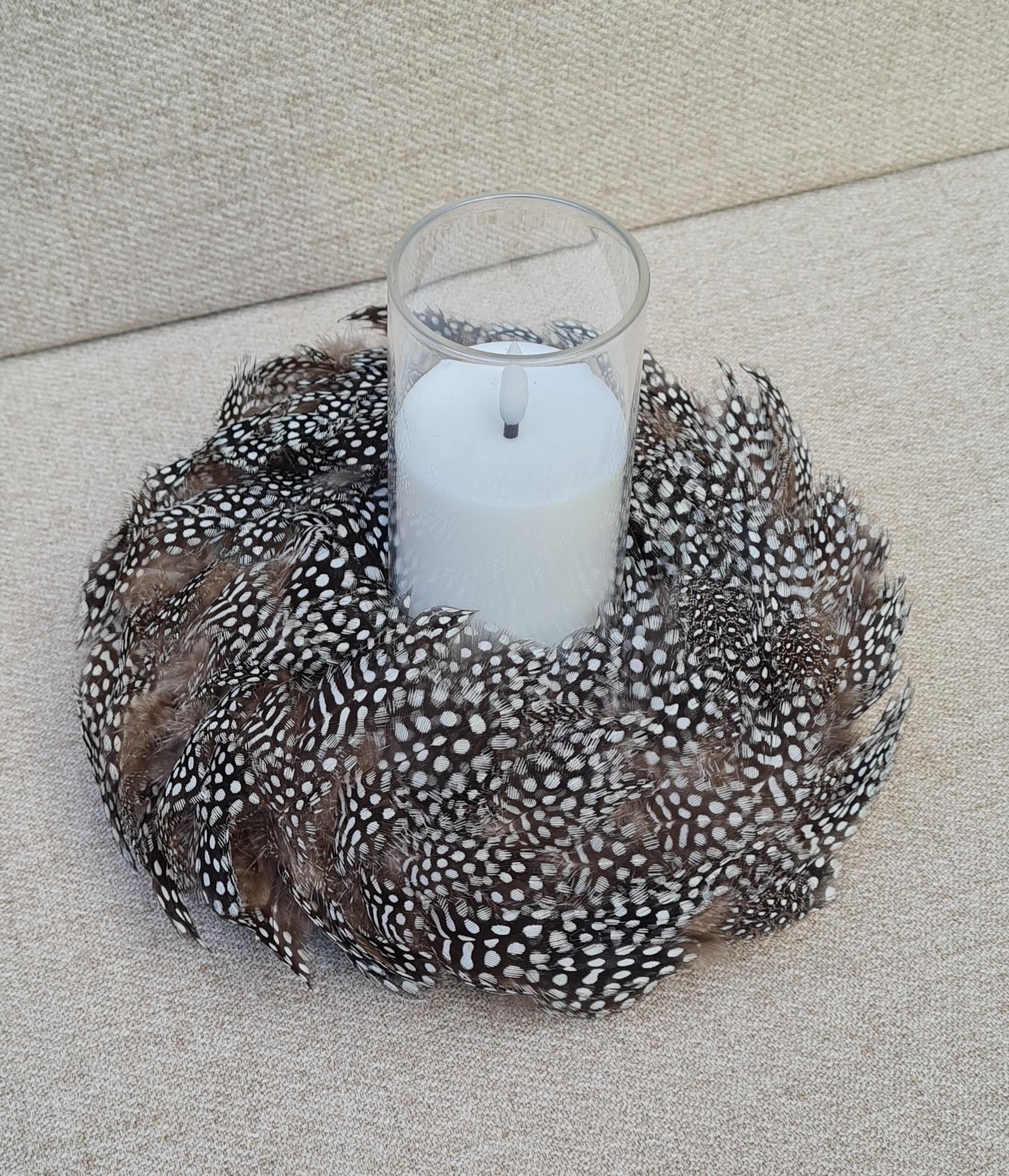 Made using naturally patterned guinea fowl feathers, the wreath features distinctive black, ivory and soft brown markings that create texture, contrast and gentle movement. Its compact size makes it ideal for layered styling, intimate spaces, or subtle statement décor.