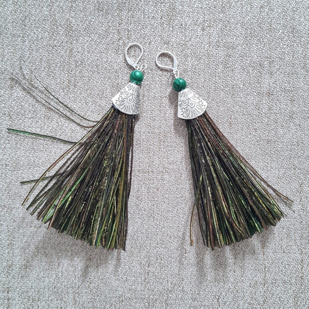 Handcrafted from fine peacock frond feathers, these drop earrings shimmer with deep green and bronze iridescence. Accented with polished malachite gemstone beads and finished with silver-toned fittings, they offer graceful movement and a beautifully balanced silhouette. Each pair is presented in Wendy Goode Designs packaging that doubles as a display box for safekeeping when not in use.